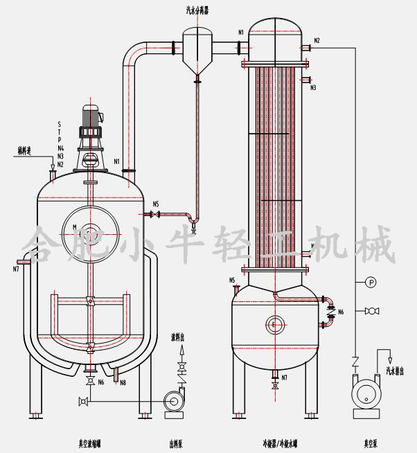 合肥小牛真空減壓濃縮器加熱形式可根據(jù)用戶工況設(shè)計(jì)為蒸汽加熱式或電加熱式,滿足無鍋爐熱源的用戶使用。真空濃縮罐設(shè)有夾套及保溫層,夾套內(nèi)通入蒸汽(蒸汽加熱式)或?qū)嵊停娂訜崾剑┻M(jìn)行加熱,從而給濃縮罐內(nèi)物料間接傳熱,耐高溫保溫層能有效隔熱保溫,減少能耗,有效避免操作人員燙傷事故發(fā)生。罐體配有視鏡視燈,能夠隨時(shí)觀察罐內(nèi)狀態(tài)。生產(chǎn)完成后,利用CIP自動(dòng)旋轉(zhuǎn)清洗球能夠?qū)迌?nèi)進(jìn)行360度沖洗。特殊定制的攪拌裝置有效地避免了料液因濃度過高而出現(xiàn)的粘壁現(xiàn)象,攪拌裝置采用優(yōu)質(zhì)機(jī)械密封,確保不會(huì)因高真空而出現(xiàn)漏氣現(xiàn)象。真空濃縮罐內(nèi)物料受熱而產(chǎn)生的蒸汽中帶有有效成份的泡沫在汽液分離器中被分離出來通過管道回流至罐內(nèi),其余二次蒸汽通過列管式換熱器被冷凝成液體,進(jìn)入冷凝水收集罐,最后排出或回收利用,不凝性氣體隨真空泵一起排出。該設(shè)備可進(jìn)行負(fù)壓或常壓操作,也可以進(jìn)行連續(xù)或間歇生產(chǎn)。